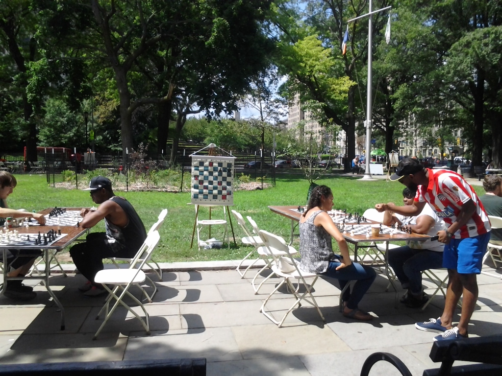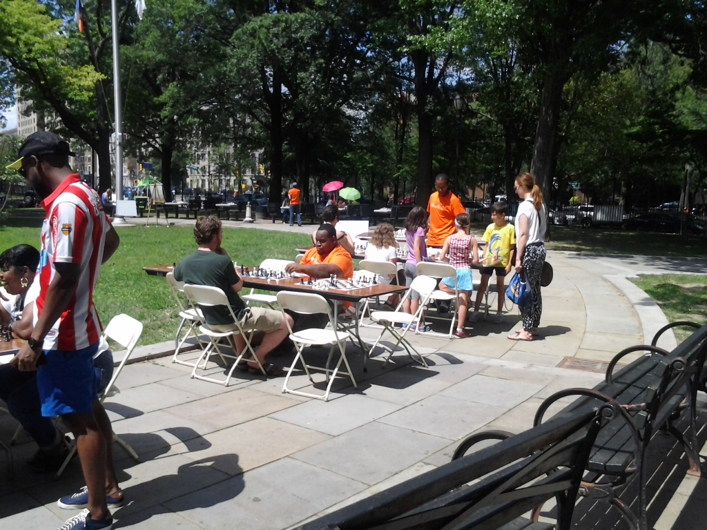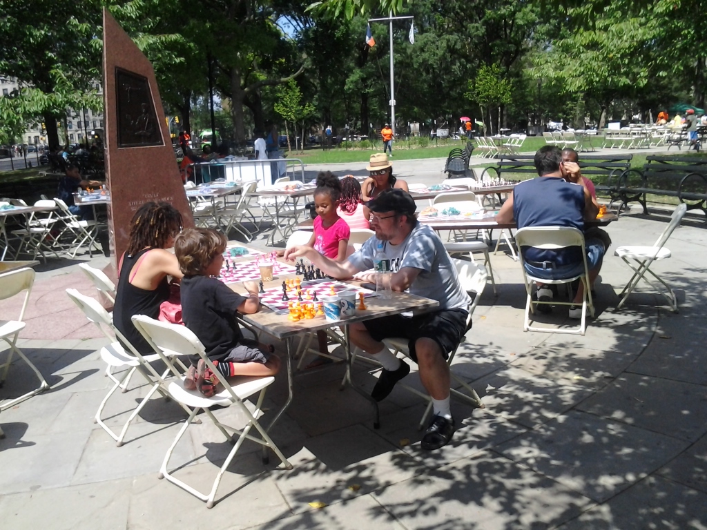 This past Saturday, Aug 9th, I was happy to help with running the wonderful free chess event – B’ROOK’LYN CHESS FESTIVAL in the Dr Roland McNair Park at Eastern Parkway organized by the New York Chess and Games in co-operation with the New York City’s Park Department. The attractions of the day for hundreds of participants included free lessons, a chance to challenge a master to a speed game ( I was one of the masters to beat- congratulations to all who made it!) and a simultaneous display by Grandmaster Giorgi Kacheishvili who faced opponents on 30 boards at the same time. It was a beautiful day and I saw a lot of people having a great day playing chess- you can see some of that fun on the pictures below. I’m looking forward to more events like this one!